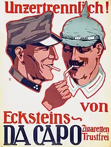 In addition to other products, the cigarette brand also belonged to the 1930s[3] range cigarette brand Da Capo, from which there is a well-known poster from the time of World War I.[4]