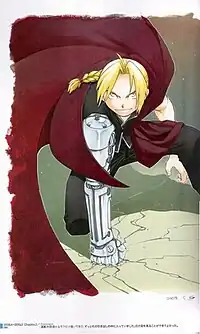 In a prototype from the series, Edward was an eighteen-year-old teenager travelling alongside his father whose soul sealed in a flying squirrel. Edward's prototype had an average height, but retained his automail. In order to fit with the readers from the manga magazine Monthly Shonen Gangan, Edward's traits were further modified, leaving his current one. His height was reduced in order to contrast with Alphonse's huge armor.[10] In the design of the character, Arakawa is often worried about not making his automail too bulky to avoid balancing it by increasing Edward's muscles, making his appearance unsuitable for his age.[11] She has also often drawn the character in full body length, but at one point noticed she made it too tall.[12][13] As the manga continued serialization, Arakawa found that she drew Edward half naked several times even more than Alex Louis Armstrong who tends to show his torso. While stating that this was because she wanted to draw Edward's automail, she commented that it was common for men to walk in underwear at their homes.[14]