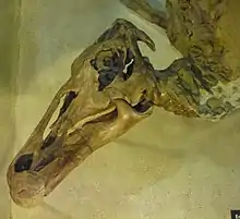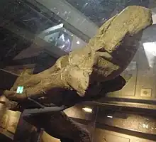 The Edmontosaurus mummy SMF R 4036 is an exceptionally well-preserved dinosaur fossil in the collection of the Naturmuseum Senckenberg (SM) in Frankfurt am Main, Germany. Found in 1910 in Wyoming, United States, it is ascribed to the species Edmontosaurus annectens (originally Trachodon), a member of the Hadrosauridae ("duckbilled dinosaur"). The fossil comprises a nearly complete skeleton that was found wrapped in impressions of its skin, a rare case of exceptional preservation for which the term "dinosaur mummy" has been used.[1] Notably, the horny beak is preserved with this specimen. Plant remains found within the thorax cavity had been interpreted as stomach contents, although later research questioned this identification. The mummy's hands are wrapped in skin impression, which was interpreted as evidence for interdigital webbing and an aquatic lifestyle in hadrosaurids; this hypothesis, although universally accepted once, is now widely refused. SMF R 4036 is one of the four best preserved hadrosaurid mummies, and was the second to be discovered.[2] The find was made by fossil hunter Charles Hazelius Sternberg and his sons, who sold their numerous finds to various museums in North America and Europe. Only two years earlier the Sternbergs had discovered the Edmontosaurus mummy AMNH 5060 in the same region, which is now on display at the American Museum of Natural History (AMNH) in New York City.