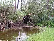At Lake Harbor, a tiny lakefront community near the western boundary of Palm Beach County, only seven homes were left standing after the hurricane.[95] About 743 homes[92] – roughly 80% of the dwelling in South Bay – were damaged,[93] and 63 residences were destroyed.[92] The city hall and the fire station suffered heavy roof damage.[96] In Canal Point, trees, branches, power lines, and electrical poles were toppled. Almost complete destruction of the community's mobile homes parks occurred. Several other homes and buildings were inflicted with serious damage.[89] Overall, damage occurred at about 60% of homes in Canal Point.[94] Some historical buildings damaged by hurricanes Frances and Jeanne in 2004 were destroyed by Wilma.[97] State Road 80, one of the only routes between eastern and western Palm Beach County, was closed after a Florida Power & Light transmission line fell across the highway about 1 mi (1.6 km) west of Lion Country Safari.[91] At the Loxahatchee National Wildlife Refuge (NWR), 85% of tree islands – "small, wetland forest communities imbedded in a matrix of freshwater marsh" – were damaged by the storm. Less than 50% of the canopies were removed at most tree islands, while the tree islands that suffered the worst impact had larger trees and were near the center of Loxahatchee NWR.[98] The office and visitor centers were both severely damaged and later rebuilt.[99]