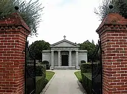 At the turn of the 20th century, the cemetery was abandoned and its brick chapel destroyed by fire. Walter P. Temple, a grandson of the Workmans, successfully filed a lawsuit preventing any further desecration of the cemetery. In 1917, he was able to purchase the cemetery and the surrounding 75 acres (300,000 m2) and began restoration. In place of the chapel, however, he built a cast stone Neoclassical mausoleum and moved the remains of his family inside. In 1921, he also transferred the remains of Pío Pico and his wife, Ygnacia Alvarado de Pico, from old Calvary Cemetery on North Broadway in Downtown Los Angeles, which was being relocated, and had them entombed in the mausoleum.[2]
