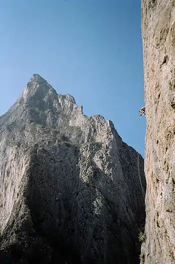 El Toro as seen from Mota Wall. El Sendero Luminoso (5.12+) rises from the base of the mountain on the far right side of the image.[1]