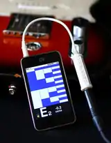 In music, an electronic tuner is a device that detects and displays the pitch of musical notes played on a musical instrument. "Pitch" is the perceived fundamental frequency of a musical note, which is typically measured in Hertz. Simple tuners indicate—typically with an analog needle or dial, LEDs, or an LCD screen—whether a pitch is lower, higher, or equal to the desired pitch. Since the early 2010s, software applications can turn a smartphone, tablet, or personal computer into a tuner.[1] More complex and expensive tuners indicate pitch more precisely. Tuners vary in size from units that fit in a pocket to 19" rack-mount units. Instrument technicians and piano tuners typically use more expensive, accurate tuners.[2]