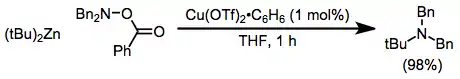 - ↑ Berman, Ashley M.; Johnson, Jeffrey S. (2006-01-01). "Copper-Catalyzed Electrophilic Amination of Organozinc Nucleophiles: Documentation of O-Benzoyl Hydroxylamines as Broadly Useful R2N(+) and RHN(+) Synthons". The Journal of Organic Chemistry. 71 (1): 219–224. doi:10.1021/jo051999h. ISSN 0022-3263. PMID 16388639.