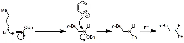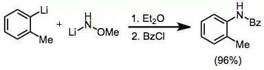 - ↑ Beak, Peter; Selling, Gordon W. (1989). "Displacements at the nitrogen of lithioalkoxylamides by organometallic reagents". J. Org. Chem. 54 (23): 5574–80. doi:10.1021/jo00284a034.