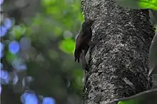 The elegant woodcreeper's diet is mostly arthropods but also occasionally includes small verterbrates. Single birds or pairs are often a core species in mixed-species foraging flocks; it favors those led by Thamnomanes antshrikes. It mostly feeds from the understory to about 10 m (33 ft) above the ground, but will go up to about 20 m (66 ft). It hitches up and along trunks and branches and captures prey by gleaning and by pecking bark crevices, clusters of dead leaves, epiphytes, and dead wood. It infrequently follows army ant swarms, where it forages near the ground mostly by pecking prey from trunks but also by sallies from a perch.[4][6][7]