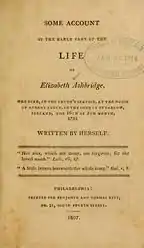 Sometime between the death of her second husband in 1741 and her marriage to Aaron Ashbridge in 1746, Elizabeth Ashbridge recorded the story of her life with focus on her religious experiences and conversion to the Society of Friends. Titled Some Account of the Fore Part of the Life of Elizabeth Ashbridge, her spiritual and historical narrative is the source of the majority of present-day knowledge regarding her early life and religious beliefs. Few records exist regarding her life in colonial America prior to her activism in the Society of Friends.[27] Even the original manuscript of her Account is not accounted for; most later editions are based on the first edition, published in 1774.[28]