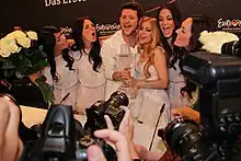 The Azerbaijani performance featured Ell and Nikki dressed in white outfits designed by Lars Wallin and performing with four backing vocalists.[32] The performance began with the backing vocalists standing in a line before walking off in sync to reveal Ell and Nikki behind them. The LED screens displayed predominantly white colours which later changed to gold blinking lights and the performance also included a pyrotechnic waterfall effect.[33][34] The performance was directed by Rennie Mirro and Filip Adamo.[35] The four backing vocalists that joined Ell and Nikki on stage were Åsa Engman, Jessica Marberger, Lisa Stadell and Vera Prada.[36]