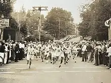 In 1939, Brown was the first runner to break the 2:30 mark on the post-1926 Boston course.[7] According to official data from the Boston Athletic Association, many runners prior to 1926 finished the Boston Marathon in times under 2:30 (see List of winners of the Boston Marathon). Those runners competed on courses known to be shorter than the IAAF-defined marathon distance of 42.195 kilometers.[8] After the 17-mile mark in the 1939 race, Brown also broke every checkpoint record.[9] He would later qualify for the 1940 U.S. Olympic team but the games were canceled due to World War II's outbreak in Europe.[10]