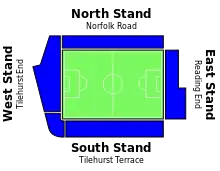 The north (with a capacity of 4,000 seated) and south (6,000 standing) stands were covered;[5] the west and east stands were uncovered terraces.[2] The east stand was reserved for away supporters, as was a small section of the north stand.[10]