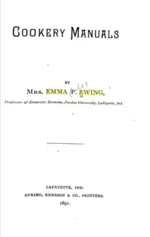 Cookery Manuals was published in 1890. During 1891, she gave nearly 250 lectures and lessons on the preparation of food.[3] In the following year, an association was formed in Chicago, called the National Household Economic Association. In 1893, this organization was enlarged. Under its auspices, Ewing gave free lessons in bread-making in the “model kitchen" of the women's building at the World's Fair.[4]