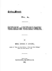 In 1883, she published a simple manual about bread-making.[3] In the same year, the department of the Iowa college was enlarged, renamed the “School of Domestic Economy,” and placed upon a level with the other schools comprising the college. At the same time it was ordered by the trustees that Ewing should be given the title of Professor of Domestic Economy. In the same year, at the solicitation of Bishop John H. Vincent, Ewing opened a summer cooking school at Chautauqua, New York, which she conducted as its dean every July and August, until 1900;[4] every season she delivered a series of lectures there on household topics.[3] Salad and Salad Making and Vegetables and Vegetable Cooking were published in 1884.[5][6]