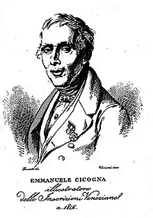 He was the son of Giovanni Antonio Cicogna and Elisabetta Bertolucci and came from a Candian family that had obtained Venetian citizenship. His book collection included editions of historical manuscripts, particularly on inscriptions in Venice and its lagoon. He published well over 100 historical, art-historical, and biographical essays, transcriptions, bibliographies, and short stories. His most notable work is the six-volume Delle iscrizioni veneziane, published between 1824 and 1853 - Carlo Dionisotti commented that "There is still no scholar of the Italian Renaissance who can do without the amazing 'iscrizioni veneziane' by Emanuele Cicogna [...]".[1]