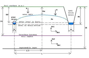The calculation of distances between drains and other parameters is based on the concept of the energy balance of groundwater flow and the hydraulic equivalent of Joule's law. For comparison, the classical concepts based on theories of Darcy and Dupuit are also used.[3]