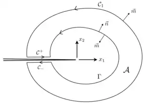 where is the elastic strain energy density, is the component of the unit vector normal to , the curve used for the line integral, are the components of the traction vector , where is the stress tensor, and are the components of the displacement vector.