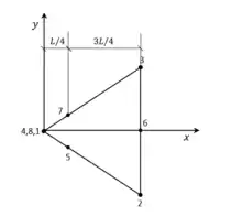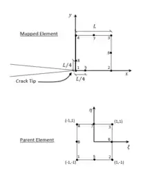 The above-mentioned methods for calculating energy release rate asymptotically approach the actual solution with increased discretization but fail to fully capture the crack tip singularity. More accurate simulations can be performed by utilizing quarter-point elements around the crack tip.[10] These elements have a built-in singularity which more accurately produces stress fields around the crack tip. The advantage of the quarter-point method is that it allows for coarser finite element meshes and greatly reduces computational cost. Furthermore, these elements are derived from small modifications to common finite elements without requiring special computational programs for analysis. For the purposes of this section elastic materials will be examined, although this method can be extended to elastic-plastic fracture mechanics.[11][12][13][14] Assuming perfect elasticity the stress fields will experience a crack tip singularity.