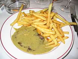 A closely similar sauce is also served by the Entrecôte groups of restaurants operated by the descendants of Paul Gineste de Saurs in Paris, Geneva, Toulouse, Lyon, Madrid, London, New York, Beirut, Doha, Dubai, Riyadh, and other cities.[4]