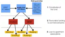 KredEx works as a revolving fund that, among other activities, supports financing of energy efficiency projects. It has received loans from the Council of Europe Development Bank (CEB) to undertake measures aimed at complying with the council's Directive 2002/91/EC on the energy performance of buildings.[20] KredEx also receives funding from the European Regional Development Fund (ERDF).