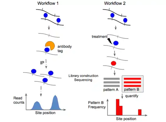 In 2012, the first two methods for m6A sequencing came out that enabled transcriptome-wide profile of m6A in mammalian cells.[1] These two techniques, called m6A-seq and MeRIP-seq (m6A-specific methylated RNA immunoprecipitation), are also the first methods to allow for any type of RNA modification sequencing. These methods were able to detect 10,000 m6A peaks in the mammalian transcriptome; the peaks were found to be enriched in 3’UTR regions, near STOP codons, and within long exons.[4][3]