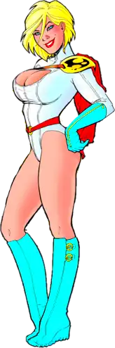 Although she and Supergirl are biologically the same person, there are vast differences between the two. Power Girl is much older than her Prime-Earth counterpart, and as such has a more curvaceous and voluptuous figure, with her most notable feature among fans being her large breasts. Compared to Supergirl she is more level-headed due to her maturity, and her fighting style is more aggressive. She also adopts a different secret identity from her counterpart. These changes are reflected in their differing costumes and superhero names as well; Power Girl sports a bob of blond hair; wears a distinctive white, red, and blue costume with a cleavage-displaying cutout. The name Power Girl reflects that she chooses not to be seen as a derivative of Superman, but rather her own hero and this choice is reflected in the strong independent attitude of the character. Over various decades, Power Girl has been depicted as a member of superhero teams such as the Justice Society of America, Infinity, Inc., Justice League Europe, and the Birds of Prey.