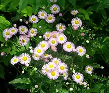 Philadelphia fleabane is a herbaceous plant growing to about 15–76 centimetres (1⁄2–2+1⁄2 feet) tall. The leaves are alternate, simple and up to 15 centimetres (6 inches) long,[5] on hairy stems. The middle to lower leaves are heart shaped. The flower heads are borne in spring in arrays of as many as 35 heads. Each head may sometimes contain as many as 100 to 150 pink or white ray florets surrounding numerous yellow disc florets. The blooms are less than 2.5 cm (1 in) in diameter. The stem is hairy with rough hairs. Its active growth period is from spring to summer (April to July),[6][7] with flowers until September.[5]