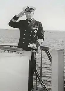 Samuelson graduated from the Royal Swedish Naval Academy in 1915 and was commissioned as a second lieutenant the same year.[2] He was promoted to sub-lieutenant in 1917,[2] attended naval mine school the same year.[3] He then took part in the minesweeping, which during the ongoing world war in the summer and autumn of 1918 was carried out in the Kattegat to enable people to carry out vital fishing even outside Swedish territorial waters. In particular, the division of three old torpedo boats, to which Samuelson belonged, did a very meritorious job in the German minefields. The Vasa Medal in gold that Samuelson held was awarded to him after the end of this minesweeping.[4] Samuelson then attended a telegraphy course in 1919 and submarine school from 1919 to 1920.[3] Samuelson then attended the French Navy torpedo school in Toulon from 1920 to 1921. Samuelson served in the submarine service between 1921 and 1933, among other things as submarine and division commander.[2] During this time he also captained patrol boats and torpedo boats. Samuelson also served aboard coastal defence ships and the cruiser HSwMS Fylgia during a trip to the Caribbean.[3] He attended the general course and the staff course at the Royal Swedish Naval Staff College from 1921 to 1923[2] and served as flag lieutenant (flaggadjutant) in the staff of the Coastal Fleet from 1924 to 1928.[1] From 1926 to 1928 he was a substitute teacher in naval art at the Royal Swedish Naval Academy. Promoted to lieutenant in 1928, Samuelson served as adjutant in the commandant staff in Karlskrona from 1933 to 1934[5] and in the Naval Staff from 1934 to 1937,[2] including as head of the Aviation Department from 1936 to 1937.[1] Samuelson was then posted as naval attaché in Rome, Italy from 1936 to 1937.[1]