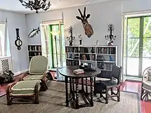 When Pauline had first seen 907 Whitehead Street during a house-scouting tour, she labeled it a "damned haunted house".[11] At the time, the house was in foreclosure and was in deep disrepair.[6] However, after recognizing its potential, she convinced her wealthy Uncle Gus to purchase it at $8,000 for her and Ernest as a wedding present.[12][13] Ernest appreciated the seclusion that the 1.5-acre lot would offer him while writing his works.[13] Employing out-of-work Conchs, the Hemingways restored the entire house.[14] Most of the house's inner furnishings were selected by Pauline, but Ernest insisted on the inclusion of his hunting trophies.[15] At the cost of air circulation, Pauline replaced the house's ceiling fans with chandeliers.[16] The couple also converted the second story of the carriage house into a writing studio for Ernest and transformed the basement into a wine cellar.[14]