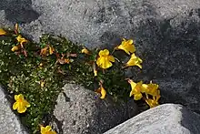Erythranthe tilingii is often nearly impossible to distinguish from its common relative, Mimulus guttatus, as their characteristics can intergrade; one of the most notable differences is the arrangement of the flowers, which are axial in M. tilingii but in a raceme in M. guttatus.[5][6][7] By 2014 three species that were formerly part of E. tilingii had been made their own separate species: Erythranthe caespitosa, Erythranthe corallina, Erythranthe minor.[8][9]