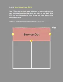 No player may volley a ball while standing in the non-volley zone or touching any of the lines around the non-volley zone. A player may enter the non-volley zone to play a ball that has bounced and may stay there to play other balls that bounce,[37]: A-22 but the player must re-establish both feet outside the non-volley zone before playing a volley. The non-volley zone is the highlighted area and numbered lines shown in the "Service out" diagram. Some players may know the non-volley zone as "The Kitchen".