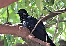 In Bangladesh, they parasitise long-tailed shrike (Lanius schach), common myna (Acridotheres tristis) and house crows (Corvus splendens) at about 35.7, 31.2 and 10.8% rates respectively.[26] Host nests at low heights and nearer to fruit trees tended to be preferred by koels.[27] In southern Thailand and the Malay Peninsula, koels have shifted host from crows to mynas (Acridotheres sp.) as the latter became more common in the late 1900s.[16] In the Indian Subcontinent they have sometimes been found to parasitize the black drongo,[28] the European magpie[29] and possibly the black-headed oriole.[30][31] In the Philippines, Asian Koels have been found to parasitize the cavity nest of Coletos (Sarcops calvus).[32] Males may distract the hosts so that the female gets a chance to lay an egg in the nest.[33][34] More often however, the female visits the nest of the host alone.[16] The koel is not known to lay eggs in an empty host nest and a study in Pakistan found that the first koel eggs were laid, on average, within one and half days of the laying of the host's first egg.[35] The chicks of the koel hatched about 3 days ahead of the host chicks.[36] Koels usually lay only an egg or two in a single nest but as many as seven to eleven eggs have been reported from some host nests.[37][38][39] A female may remove a host egg before laying. Eggs hatch in 12 to 14 days. The young koel does not always push out eggs or evict the host chicks, and initially calls like a crow. The young fledge in 20 to 28 days.[16] Unlike some other cuckoos, the young do not attempt to kill the host chicks, a trait that is shared with the channel-billed cuckoos which are also largely frugivorous as adults.[40] It has been suggested that koels, like some other brood parasites do not evict the host chicks due presumably due to the higher cost of evicting nestmates. A small parasite may not be able to evict large host eggs or chicks from a deep Corvid nest without risking starvation and possibly accidental self-eviction. An alternative hypothesis that retaining host chicks might benefit the koel chicks did not gain much support.[41] Adult female parents have been known to feed young koels in the nests of the hosts,[42][43] a behaviour seen in some other brood parasitic species as well. Adult males have however not been noted to feed fledglings.[16][44][45]