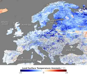 ![]() Map of Europe showing the difference of temperature between 11–18 December 2009 and the 2000–2008 average. | |