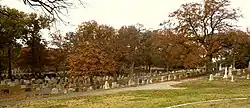 Evergreen Cemetery is a historic cemetery in the Brighton neighborhood of Boston, Massachusetts. It was established in 1850 by the town of Brighton (which was annexed to Boston in 1874), and was laid out in the then-fashionable rural cemetery style inspired by Mount Auburn Cemetery in Cambridge. Its entrance gate was built in 1892, and its Jacobethan office building was added in 1903. Boston architect James Mulcahy designed the office building. The older portions of the cemetery are characterized by winding lanes (now paved, originally gravel), with outcrops of Roxbury puddingstone.[2]