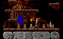 Amiga version screenshot. The Humans' user interface consists of the play area on top and displays of the player's remaining time, choice of actions and remaining tribe members at the bottom.