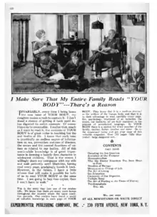 Sidney Gernsback published a hard bound Radio Encyclopedia for that was independent of Experimenter Publishing or the Consrad Company. It claimed to cover every phase of radio with "over 1930 separate definitions, 549 illustrations, a complete cross index, and many other special features." The Encyclopedia was not part of the bankruptcy. Hugo Gernsback also published magazines that appealed to a general audience. Motor Camper & Tourist was a travel guide for those that toured the United States by automobile. The July 1924 issue started a series about driving and camping across the country from New York City to San Francisco.[16] Another was Your Body, a guide to the operation and mechanics of the human body. An advertisement for the magazine claimed that "each issue is practically an endless source of information on sex, prevention and care of diseases, the senses and the normal functions of nature as related to our bodies."[17] Time magazine reviewed the first issue with an article titled "Unsexing Sex". Gernsback promoted it as a magazine for the whole family but Time felt the target audience was "radio bugs" (a 1920s term for geeks).[18]