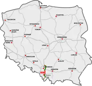 Expressway S1 or express road S1 is a Polish highway under construction with a planned length of 130 km (81 mi), in the Silesian and Lesser Poland voivodeships. Upon completion, it will connect the A1 motorway near the Katowice International Airport in Pyrzowice, with the border of Slovakia in Zwardoń, where it will connect to the D3 Motorway.