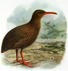 | Dieffenbach's rail | Hypotaenidia dieffenbachii | Chatham Islands[29] | Last collected in 1840. It was possibly driven to extinction by introduced predators and habitat loss due to fire.[66] | ![]() |