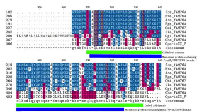 FAM76A contains a coiled-coil domain, which is located within the Band7/PHB/SPFH domain. No significant ligand-binding sites or active sites were predicted from I-TASSER.[15] There is no evidence to suggest that FAM76A interacts with other proteins to form a quaternary structure.