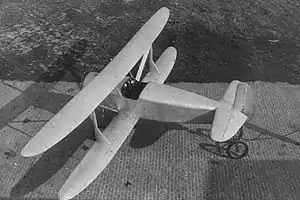 The Feiro Dongó was the second design of Lajos Rotter in his collaboration with the brothers Gyula and László Feigl.[1][2] Rotter aimed to produce a training aircraft of high aerodynamic refinement with a high lift to drag ratio (L/D) which was also stable but responsive to the controls, structurally strong, easy to land and with a good all-round view from the cockpit. An innovative wing design was a key feature. The Dongó was a biplane with wings of very high aspect ratio and modified elliptical plan, thus minimising induced drag. The upper wing had an aspect ratio of 16.9, very high at the time,[3] and both wings had a root chord of only 800 mm (31.5 in), though the lower was 1.0 m (3 ft 3 in) shorter.[2] Both had thick airfoils.[4] The very narrow wings were claimed to provide longitudinal stability, as the centre of pressure could not move far,[3] and further pitch stability was provided by heavy stagger, with the lower wing 600 mm (23.6 in) behind the upper.[2] The two wings were set at different angles of attack, 0° on the lower and 2° on the upper, again with the intention of improving longitudinal stability To provide roll stability the upper wing had dihedral beyond a short centre section. The latter was supported by a steel tube cabane which had pairs of vertical, kinked struts, faired in the upper part, and a forward, transverse inverted-V, all joined to the upper fuselage. This structure made it possible to vary the upper wing's angle of incidence and the stagger.[3] The wings were 3-ply covered, two spar structures. High aspect ratio, metal covered ailerons were mounted on the lower wings.[2]