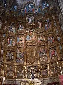 In 1499 Bigarny designed the basic structure of the main altarpiece of the Toledo Cathedral,[2] for which he was contracted by Cardinal Archbishop Francisco Jiménez de Cisneros.[3] He also prepared a figure of Saint Mark the Evangelist and agreed to sculpt several reliefs for the altarpiece, which he did between that time and 1504.[4] In those same years, he also made sculptures of Saints Augustine, Barbara, Gregory, Jerome, John the Baptist and of the Assumption for the altarpiece of the University of Salamanca. He next began plans for the chapel of the Sanctuary of the Palencia Cathedral, making it clear that although most of the work would be done by others in his studio, he personally would sculpt the faces and hands. On 12 December 1506, Bigarny delivered seventeen sculptures (among them a polychromed Saint Antoninus of Pamiers, the titular saint of the cathedral) and on 19 October 1509 he delivered the remaining nine figures. These were brought together on the main altarpiece of that cathedral. In 1509 he returned to Burgos to work with Andrés de Nájera on the choir stalls of the Burgos Cathedral, a project completed in 1512. The panels of the top row of side chairs are attributed to him and his workshop.