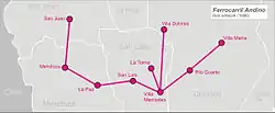 The Andean Railway (native name: Ferrocarril Andino) was a state-owned railway company in Argentina which, towards the end of the 19th century, built and operated a line connecting Villa María in Córdoba Province with the cities of Mendoza, San Luis and San Juan. The 1,676 mm (5 ft 6 in) network was later sold to a number of British-owned railway companies.