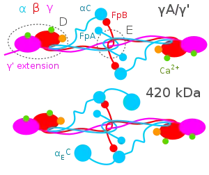 - 1 2 3 Mosesson MW (August 2005). "Fibrinogen and fibrin structure and functions". Journal of Thrombosis and Haemostasis. 3 (8): 1894–1904. doi:10.1111/j.1538-7836.2005.01365.x. PMID 16102057. S2CID 22077267.