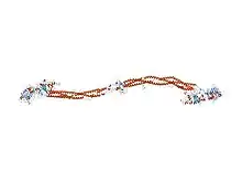 The Aα, Bβ, and γ chains are transcribed and translated coordinately on the endoplasmic reticulum (ER), with their peptide chains being passed into the ER while their signal peptide portions are removed. Inside the ER, the three chains are assembled initially into Aαγ and Bβγ dimers, then to AαBβγ trimers, and finally to (AαBβγ)2 heximers, i.e. two AαBβγ trimers joined by numerous disulfide bonds. The heximer is transferred to the Golgi where it is glycosylated, hydroxylated, sulfated, and phosphorylated to form the mature fibrinogen glycoprotein that is secreted into the blood.[10][12] Mature fibrinogen is arranged as a long flexible protein array of three nodules held together by a very thin thread which is estimated to have a diameter between 8 and 15 angstroms (Å). The two end nodules (termed D regions or domains) are alike in consisting of Bβ and γ chains, while the center slightly smaller nodule (termed the E region or domain) consists of two intertwined Aα alpha chains. Measurements of shadow lengths indicate that nodule diameters are in the range 50 to 70 Å. The length of the dried molecule is 475 ± 25 Å.[14]