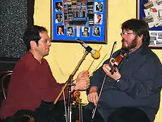 Also called "beating the straws" or "playing the straws," this technique probably arose in the eastern United States. British folklorist Fred McCormick reports that he has never encountered it among British and Irish fiddlers, and suggests that it may have arisen on American plantations as a substitute for African musical instruments.[1] The technique has become rarer over time as the music has changed,[2] but numerous examples have been recorded, for example in the "Mardi Gras Jig" by a group led by Cajun fiddler and singer Dewey Balfa,[3] or by Al and Emily Cantrell.[4]