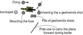 To serve a three to six pound piece, a minimum of four artillery men was required: one to put the geshwinda shot into the cannon, another to ram the shot down the barrel, a third to mount the fuse, and a fourth to fire the piece by a torch. The team was overseen by a konstapel, who was to make sure that the whole aiming, loading and firing cycle should complete within five or six seconds.