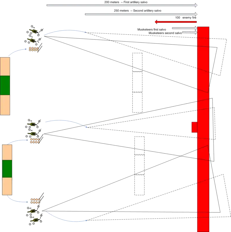 The batteries opened fire when enemy lines reached 200 meters and continued until the range from the enemies relative to the regiment was 150 meters. At that point, artillery pieces were moved forward 25 meters to a new position and so on. Since the advancement speed of the artillery was 1/2 times of the regiment, the distance between them were exponentially increased making the firing angle to shrink accordingly. At the time artillery had advanced 50 meters, own battalions had advanced an additional distance of 100 meters and ready for their first musketeer salvo now with the artillery positioned 100 meters back.