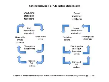 The ecological theory of alternative stable states describes how different ecosystems can exist side by side, and how they can shift as a result of disturbance. Applied to fire ecology, the theory describes how flammable and less-flammable vegetation types can exist side by side, and are maintained by different relationships with fire.[3] If the frequency and intensity of fire in each vegetation type is not disturbed, then the dominant vegetation type will be maintained, and considered stable.[1] This theory also describes how dominant vegetation can rapidly shift to another vegetation type via fire suppression, an increase in fire severity, introduction of invasive species, and other management disturbances.[1] These effects, which can cause a vegetation type to shift, are described as destabilizing transitions.