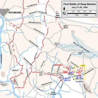 The First Battle of Deep Bottom, also known as Darbytown, Strawberry Plains, New Market Road, or Gravel Hill, was fought July 27–29, 1864, at Deep Bottom in Henrico County, Virginia, as part of the Siege of Petersburg of the American Civil War. A Union force under Maj. Gens. Winfield S. Hancock and Philip H. Sheridan was sent on an expedition threatening Richmond, Virginia, and its railroads, intending to attract Confederate troops away from the Petersburg defensive line, in anticipation of the upcoming Battle of the Crater. The Union infantry and cavalry force was unable to break through the Confederate fortifications at Bailey's Creek and Fussell's Mill and was withdrawn, but it achieved its desired effect of momentarily reducing Confederate strength at Petersburg.