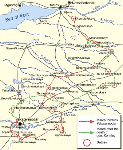 The Cossacks aimed primarily to defend their independence, but the Volunteers persuaded them that they could guarantee this only by joining with them in fighting against the Bolsheviks, who had the support of a large part of the non-Cossack population of the Don region. With the encouragement of Kaledin, the Whites, still only some 500 strong, managed to recapture the city of Rostov from local Red Guard units on 15 December [O.S. 2 December] 1917.[1] However, by the beginning of 1918 better-organised and stronger Communist forces began an advance from the north, capturing Taganrog on the Sea of Azov on 10 February [O.S. 28 January] 1918. Kornilov, now in command of some 4,000 men at Rostov, judged it pointless to attempt a defence of the city in the face of superior forces. Instead, the Volunteers made ready to relocate to the south, deep into the Kuban, in the hope of attracting more support, though the whole area was in deep winter. Thus began the Ice March. With his defenses gone and his government in a state of collapse, Kaledin shot himself (11 February [O.S. 29 January] 1918).