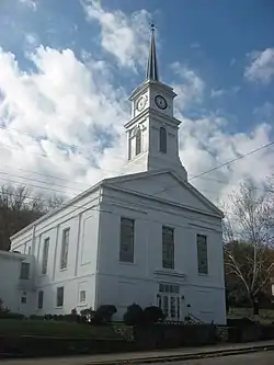 The First Presbyterian Church of Aurora, Indiana is a historic Presbyterian congregation and church located at Aurora, Dearborn County, Indiana. The original building completed in 1855 is still used, and is believed to have been designed by architect John R. Hamilton. It is a two-story, rectangular, Greek Revival style red brick building painted white. It measure approximately 45 feet wide by 75 feet deep and rests on a rough cut limestone foundation. It features a steeply tower consisting of a base, belfry, clock, and steeple.[2]: 5, 7