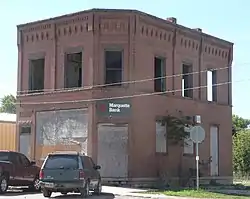 It was designed in commercial Romanesque Revival style by architect E.R. Bogardus, with brick corbelling, a corner front entrance, and long rectangular windows, and it cost $3,843.00 to build.[3]